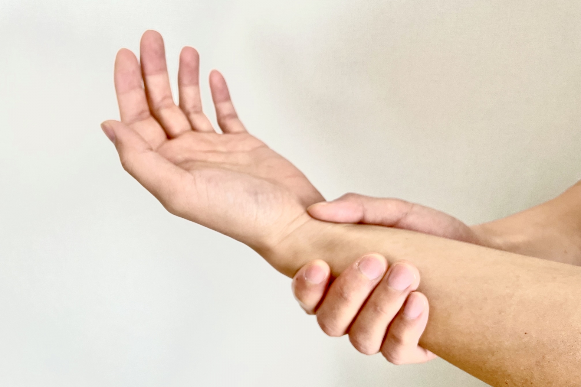 ぐるっと手首1周ではなく、親指側の手首だけに経験します。ここが腫れたり痛んだりし、何もしていなくても痛む事もあれば手を使っている最中に強く痛む場合もあります。